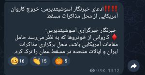 در ادامه اخبار جعلی منتشر شده درباره مذاکرات ایران و آمریکا درمسقط، برخی کانال های تلگرامی به نقل جان گمبرل، خبرنگار خبرگزاری آسوشیتدپرس (AP)، مدعی شدند: کاروانی از خودروها که به نظر میرسد حامل مقامات آمریکایی باشد، محل برگزاری مذاکرات ایران و ایالات متحده در مسقط عمان را ترک کرد.