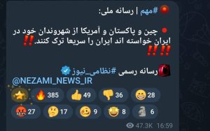 برخی کانالهای خبری مدعی شدند که دولت چین از شهروندان خود خواسته ایران را بصورت زمینی ترک کنند.